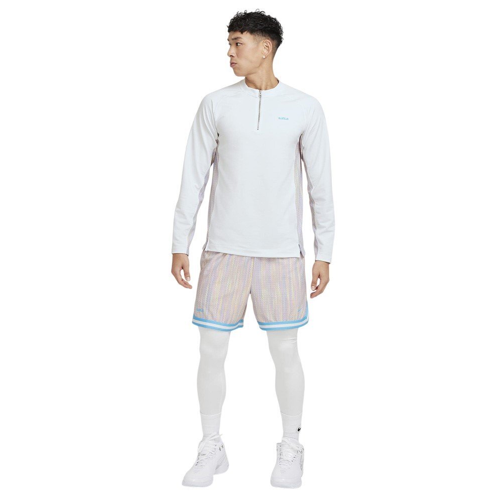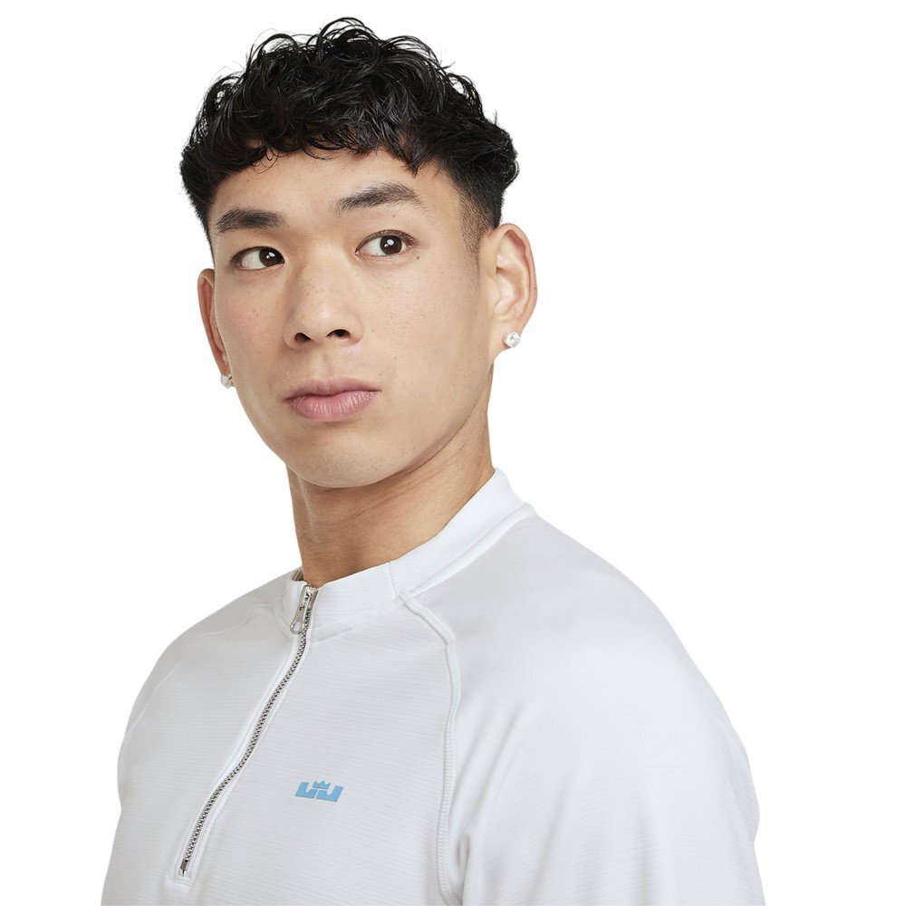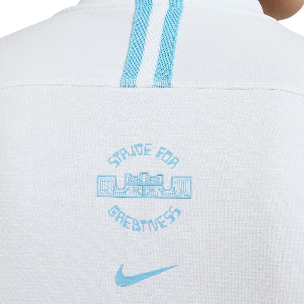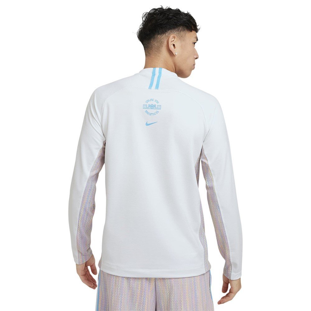 Футболка Nike Dri-FIT LeBron DNA — уникальный предмет одежды для поклонников баскетбола и спортивного стиля, изготовленный из технологичного материала, сочетающего комфорт и первоклассную функциональность. Длинный рукав обеспечивает оптимальную защиту от холода, а мягкий эластичный трикотаж создает эффект второй кожи, идеально подстраиваясь под силуэт. Передовая технология Nike Dri-FIT эффективно отводит влагу, сохраняя тело сухим во время активности. Разноцветные сетчатые вставки придают динамичный спортивный характер, а дизайнерская молния длиной 1/4 позволяет легко регулировать и переодеваться. Фирменный логотип и мотивационный девиз Леброна Джеймса на груди и спине подчёркивают уникальный характер футболки.