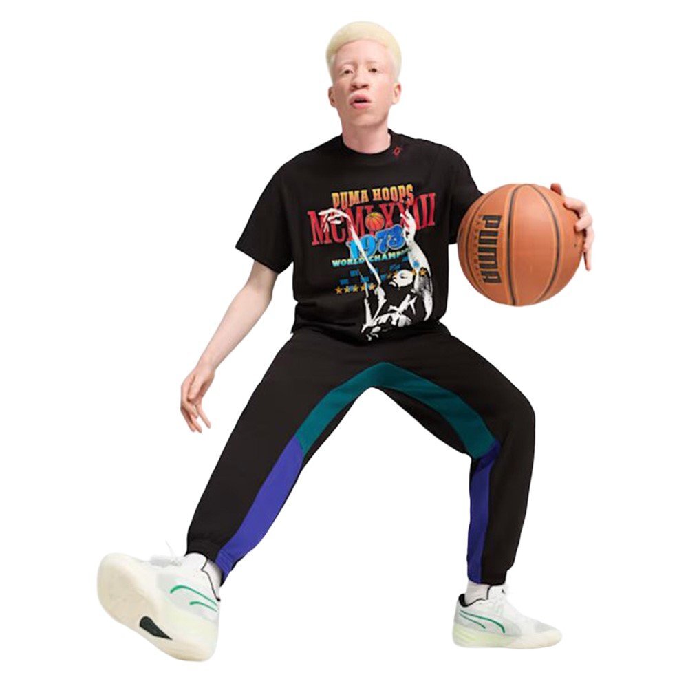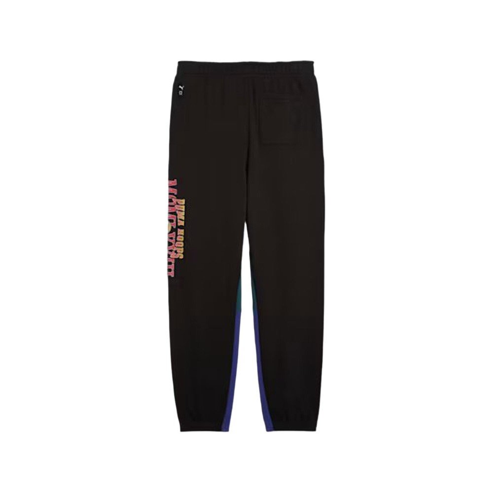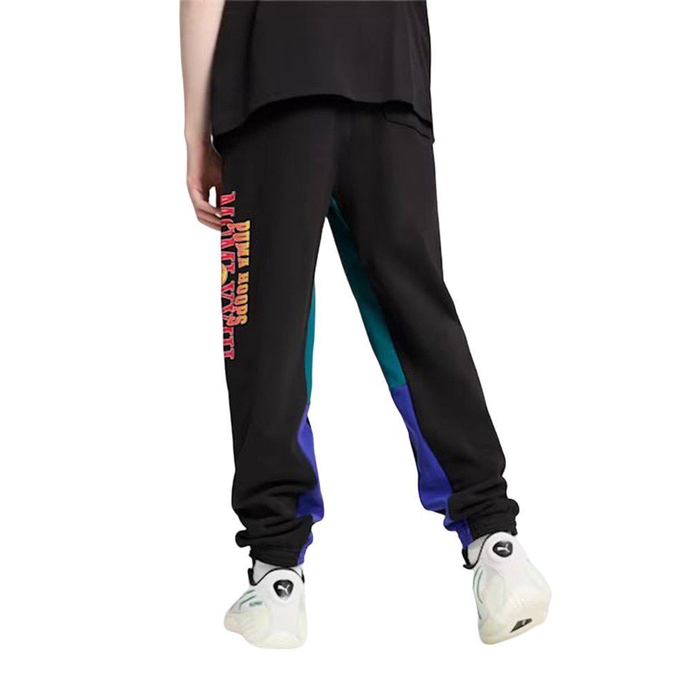 Брюки Puma Bandwagon — стильные и удобные спортивные брюки свободного кроя, обеспечивающие свободу движений и комфорт. Они изготовлены из мягкой, дышащей ткани, типичной для спортивной одежды, и выполнены в черном цвете, что придает им универсальность. Они выделяются эффектной графикой на штанинах, в том числе в баскетбольном стиле. Брюки имеют практичные боковые карманы для мелочей и характерные детали PUMA Hoops, отсылающие к баскетбольной линейке бренда.